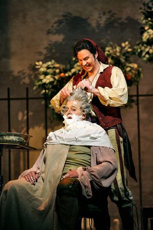 Peter Mattei (standing) as Figaro and John Del Carlo as Dr. Bartolo in Rossini’s “Il Barbiere di Siviglia.”