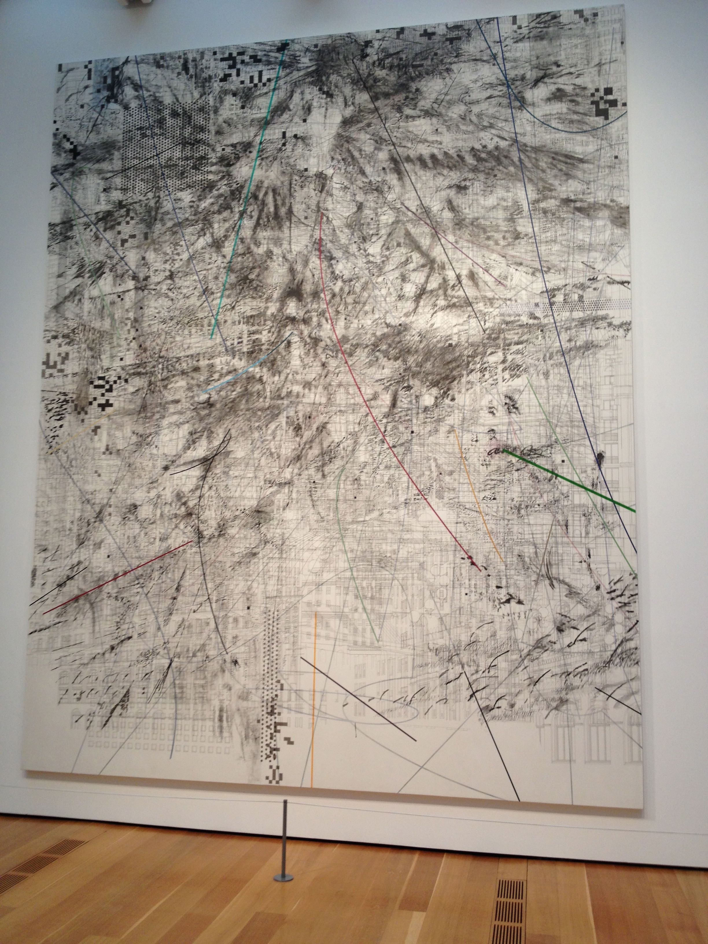 Alluding to the events of the Arab Spring, her Mogamma series – titled in reference to the government building just south of Tahrir Square in Cairo, Egypt – features detailed renderings of structures in Tripoli, Libya; Cairo; and other Middle Eastern cities where uprisings have occurred recently. Produced for the 2012 exhibition Documenta XIII in Germany, this series – including the High’s recent acquisition – exhibits Mehretu’s deft use of gestural marks, sweeping lines, and silkscreened patterns, suggesting the often urgent and always complex patterns of migrant peoples.