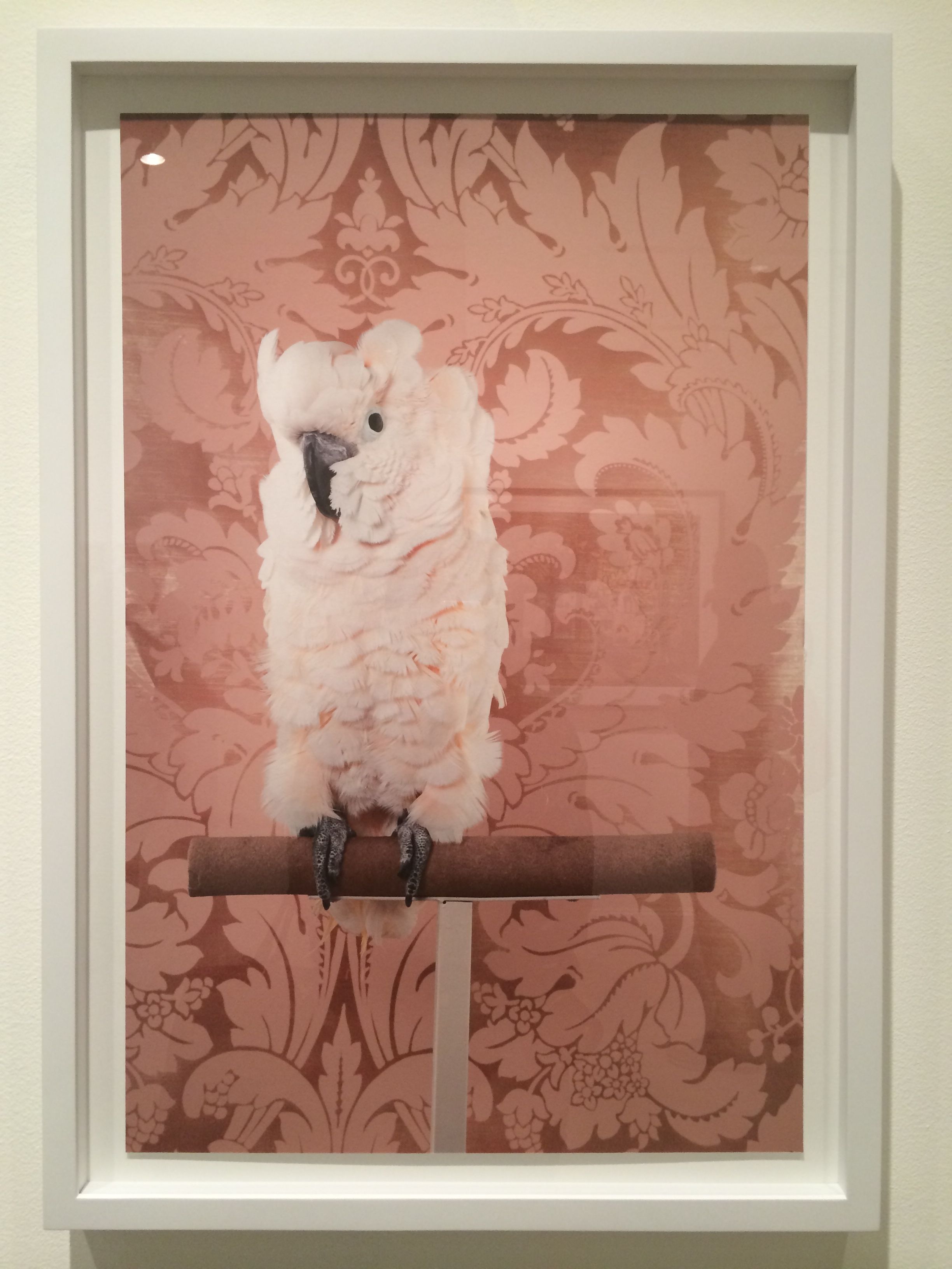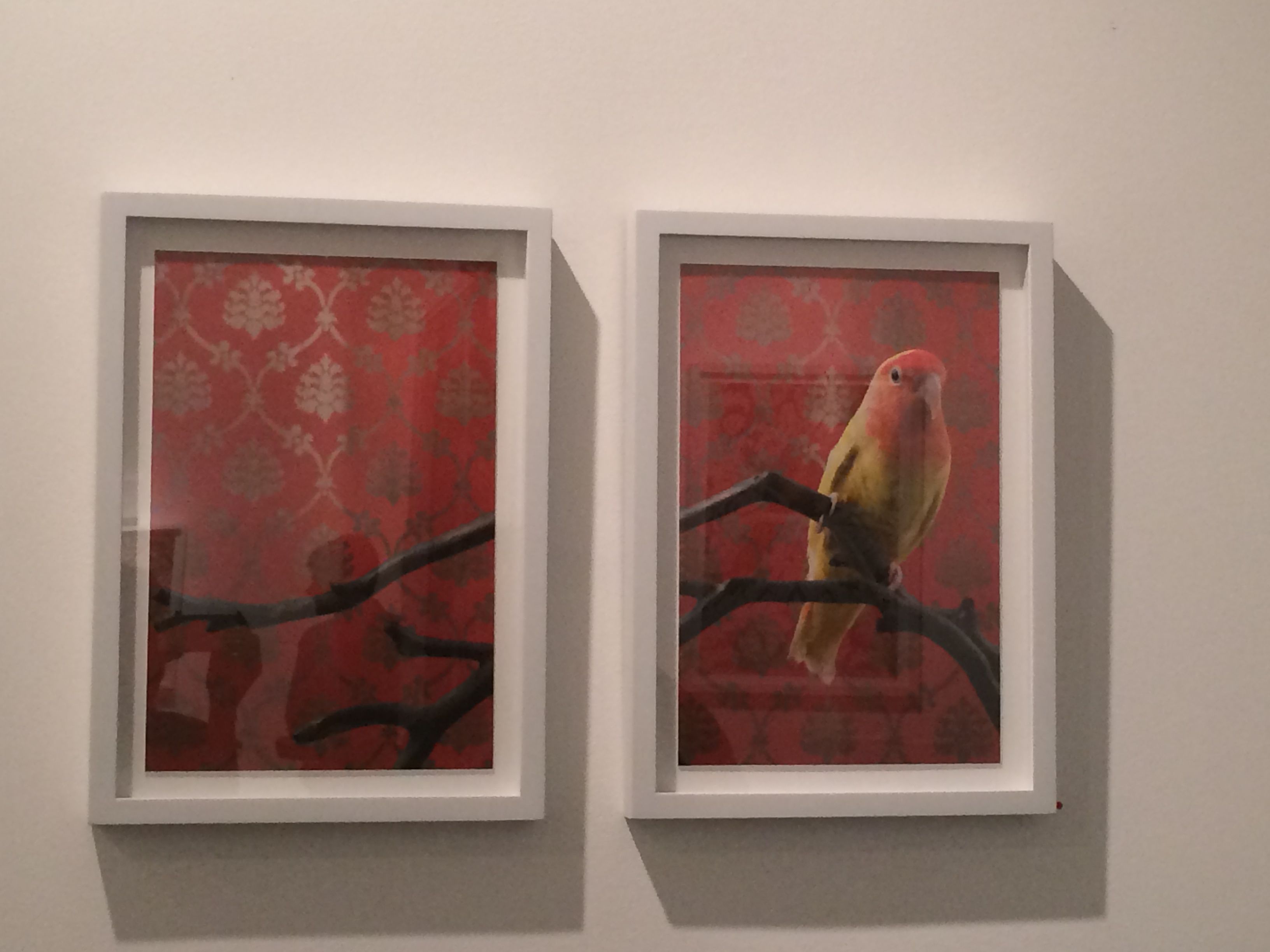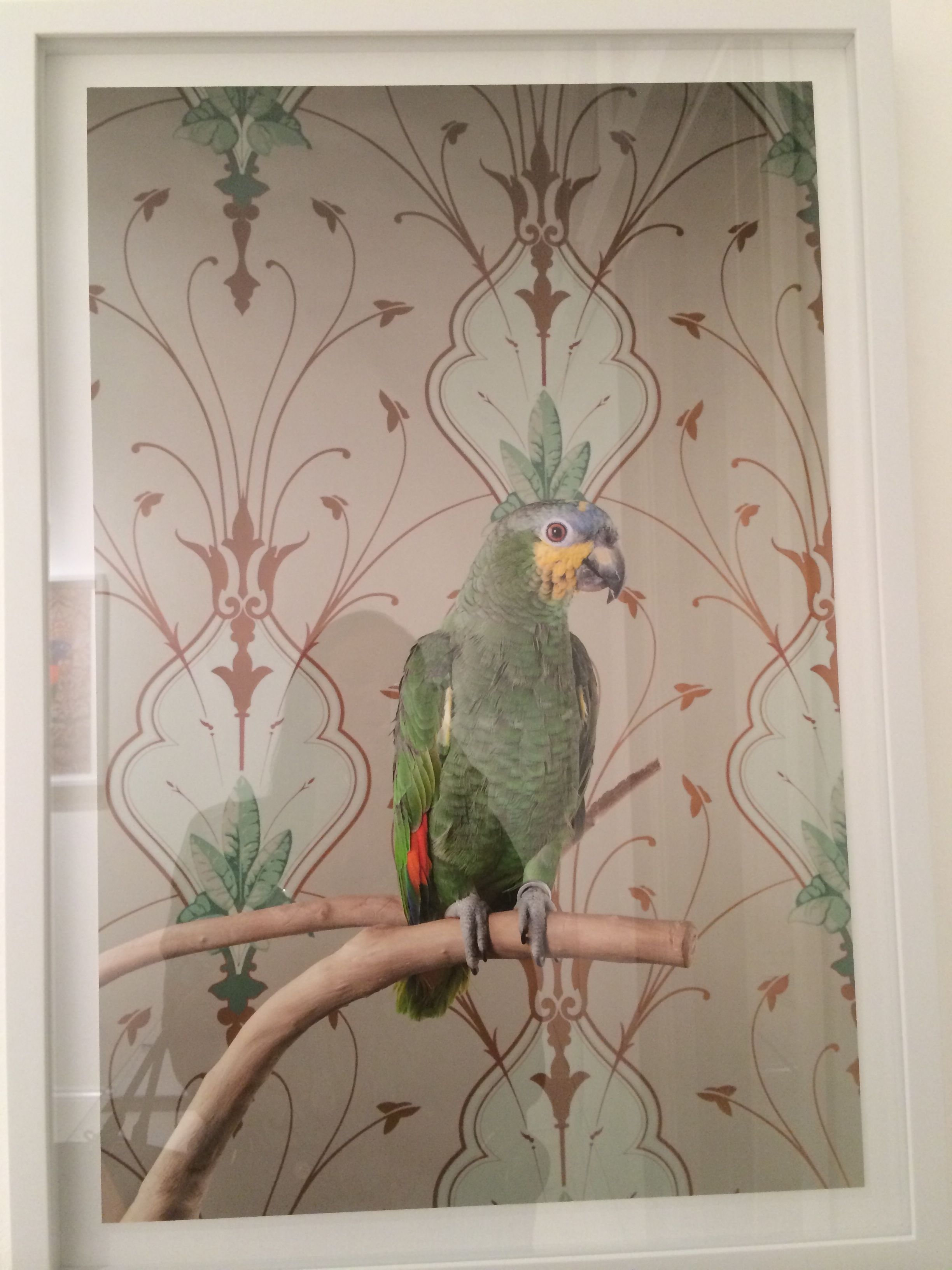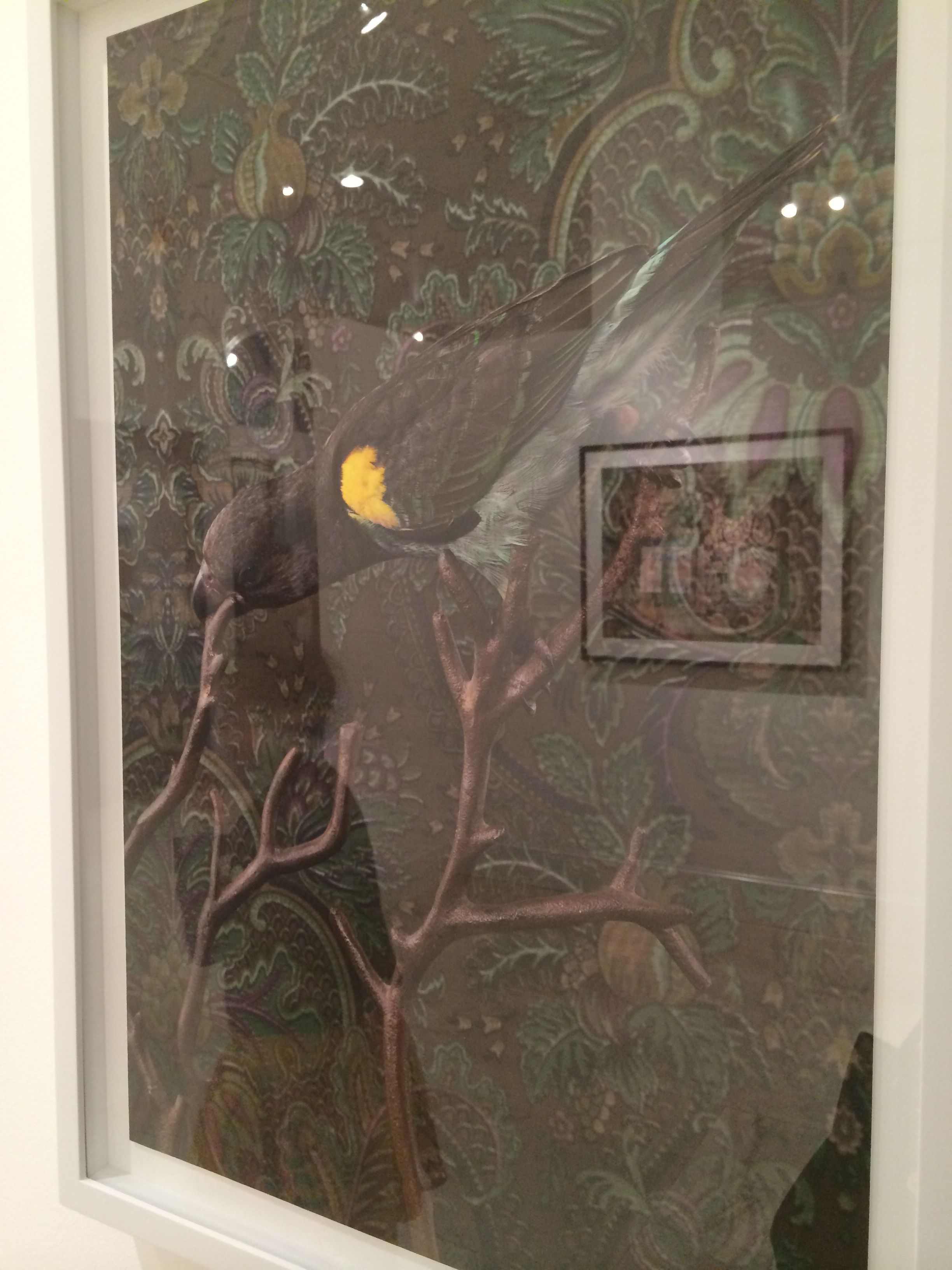 CLAIRE ROSEN (b.1983 New Jersey)- Known as a photographer whose whimsical imagery is inspired by fairy tales and fables, Rosen presents birds that are posed against complimentary vintage wallpaper. The resulting optical illusion of visual blending is reminiscent of Victorian Optical Illusion Postcards in which the image of the bird can either be seen as a flat part of the wallpaper or as bird posing in front of the wallpaper. The visual relationship presented in the series between birds and wallpaper serves as the beginning of a discussion about how people see themselves in their environment. Some of the birds appear to be posing, as people would, to try and stand out from their surroundings and draw attention. Other birds turn their back to the camera and seem to want to use the wallpaper to camouflage themselves out of the center of attention. In both case, Birds of a Feather opens a dialog about the relationships between animals, humans and interior design.
