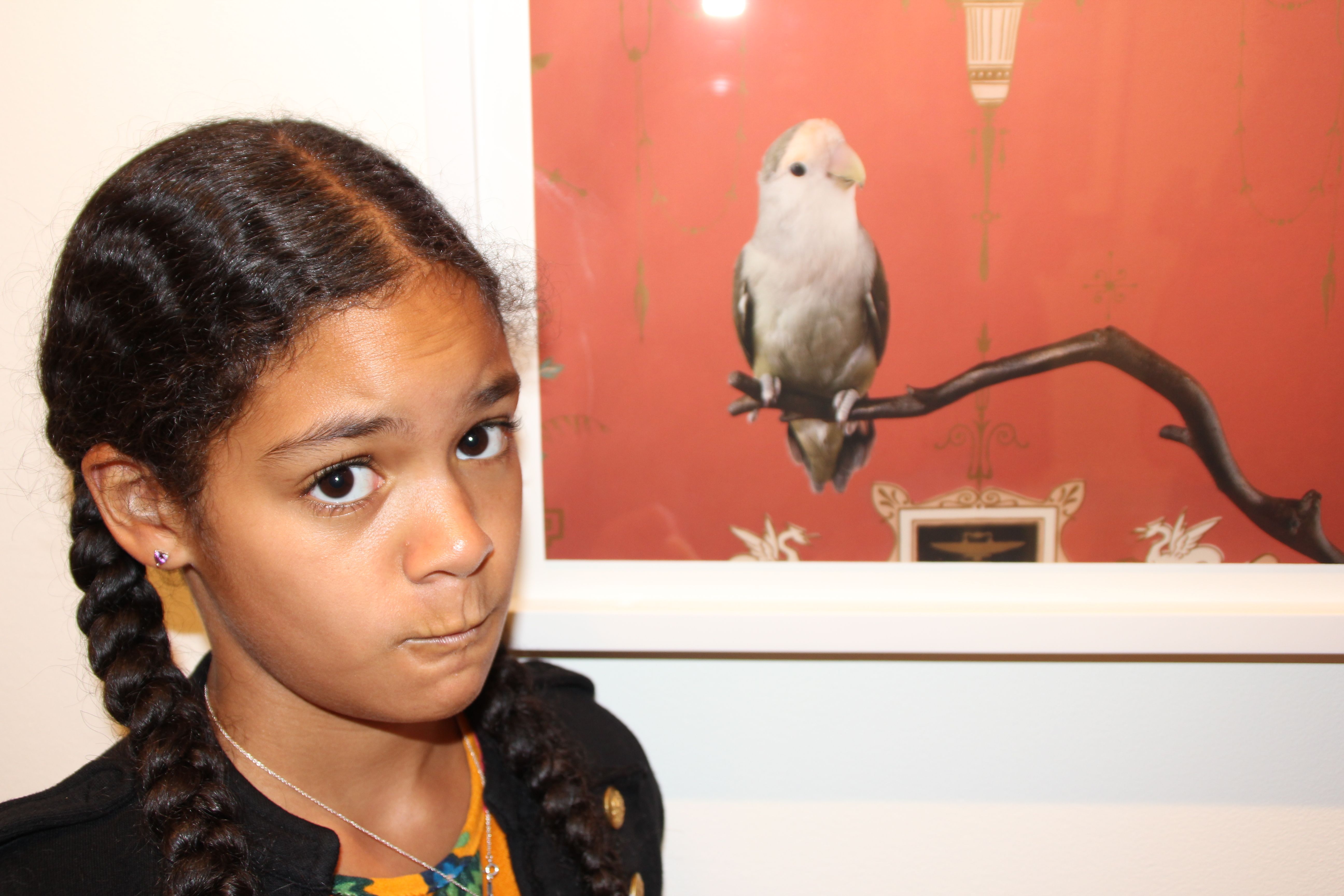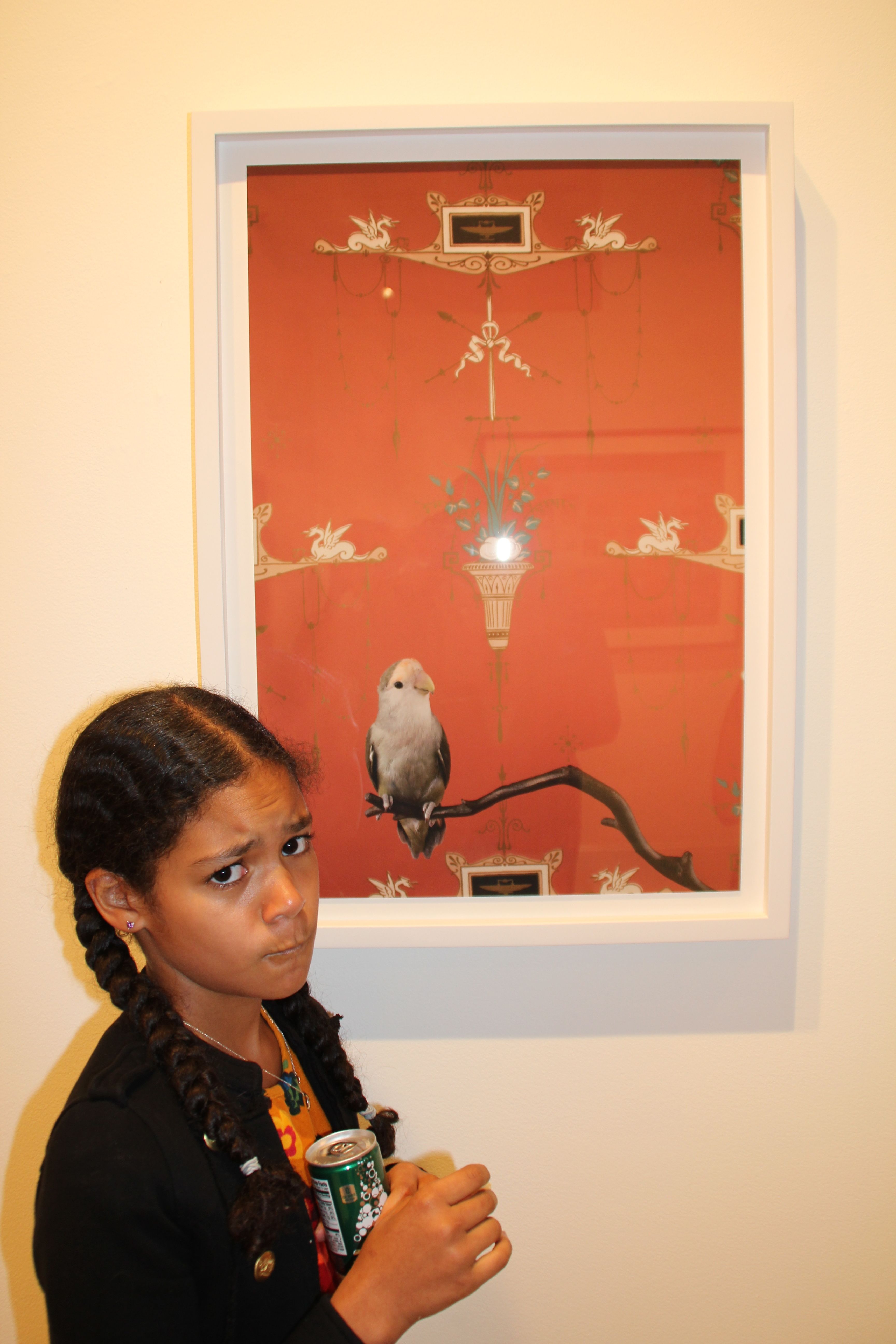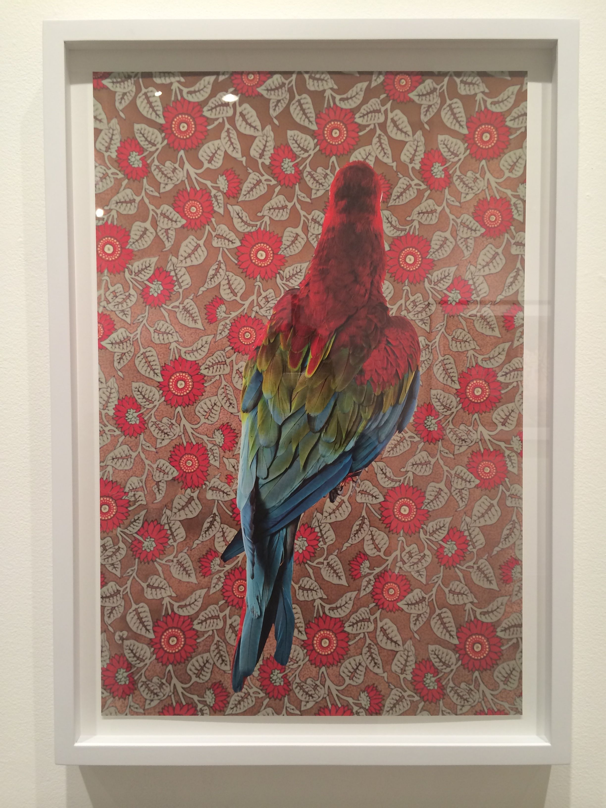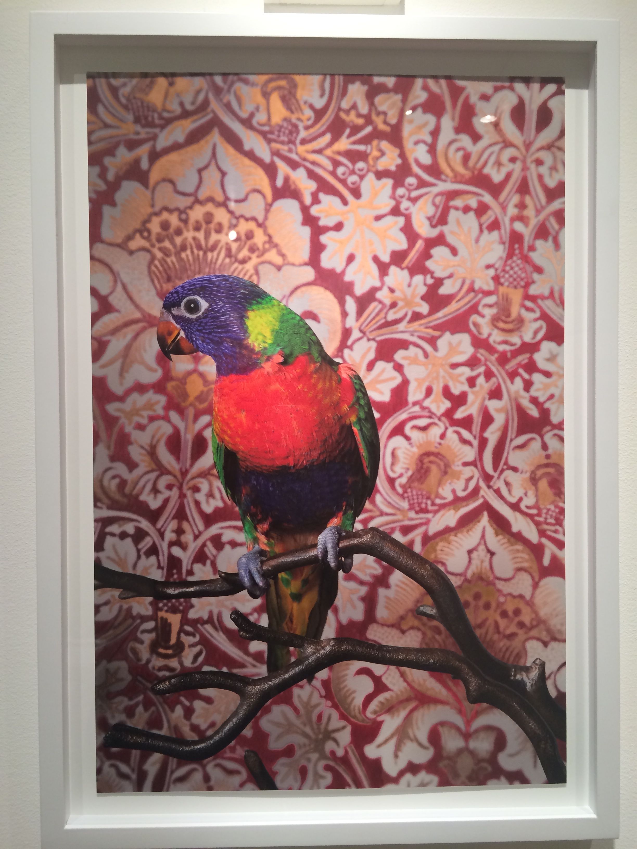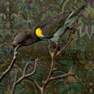 CLAIRE ROSEN (b.1983 New Jersey)- Known as a photographer whose whimsical imagery is inspired by fairy tales and fables, Rosen presents birds that are posed against complimentary vintage wallpaper. The resulting optical illusion of visual blending is reminiscent of Victorian Optical Illusion Postcards in which the image of the bird can either be seen as a flat part of the wallpaper or as bird posing in front of the wallpaper. The visual relationship presented in the series between birds and wallpaper serves as the beginning of a discussion about how people see themselves in their environment. Some of the birds appear to be posing, as people would, to try and stand out from their surroundings and draw attention. Other birds turn their back to the camera and seem to want to use the wallpaper to camouflage themselves out of the center of attention. In both case, Birds of a Feather opens a dialog about the relationships between animals, humans and interior design.