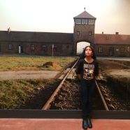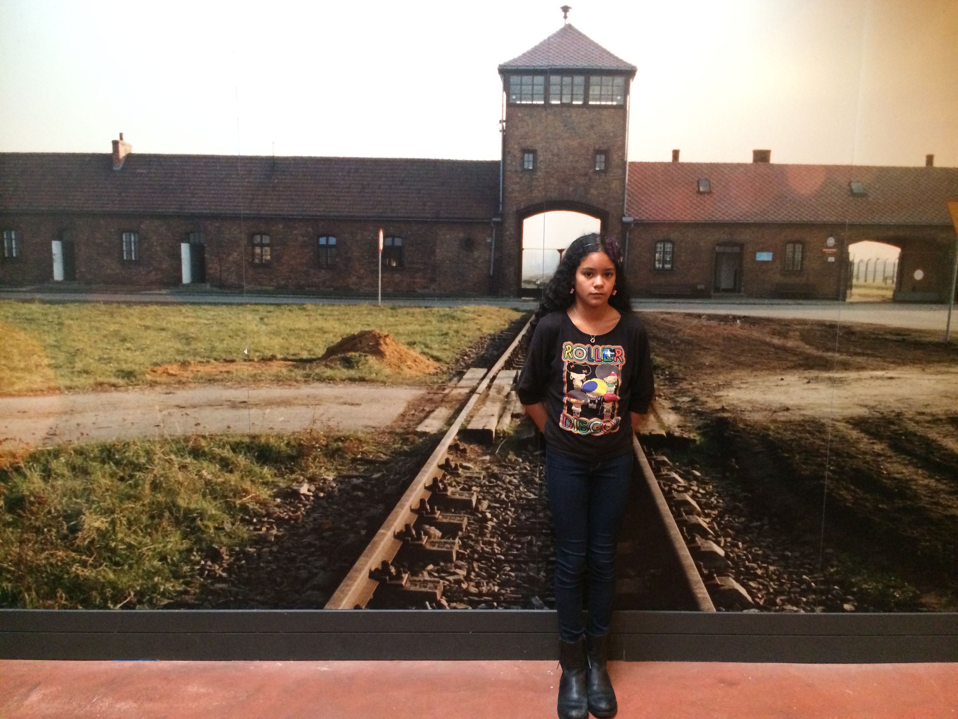 Layla in front of concentration camp image
