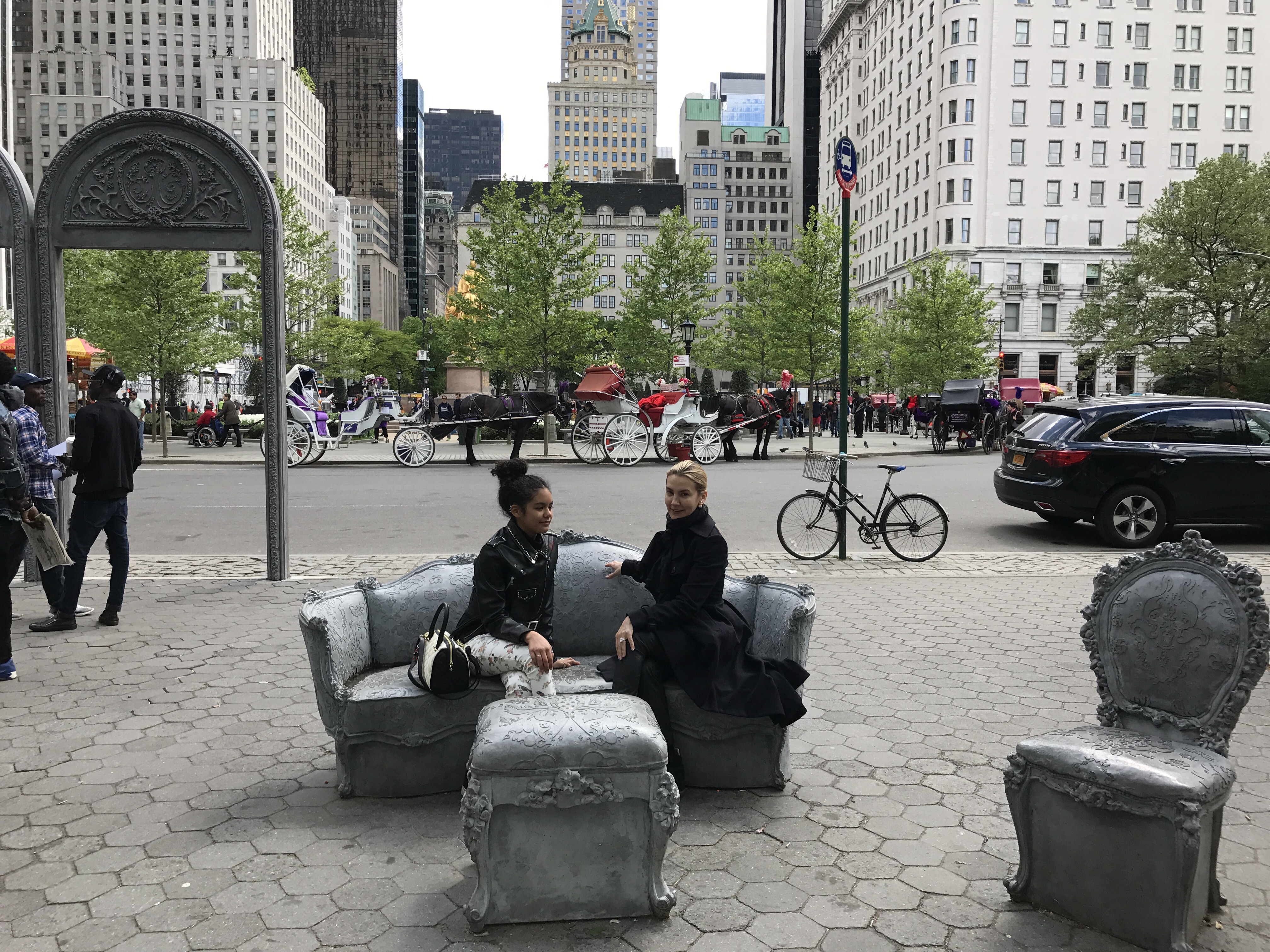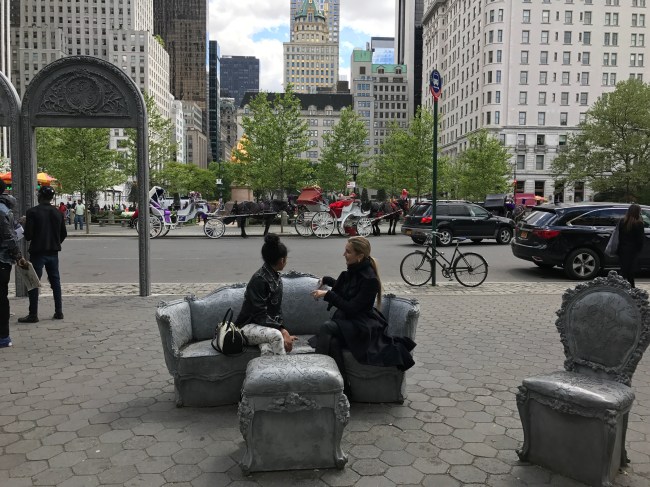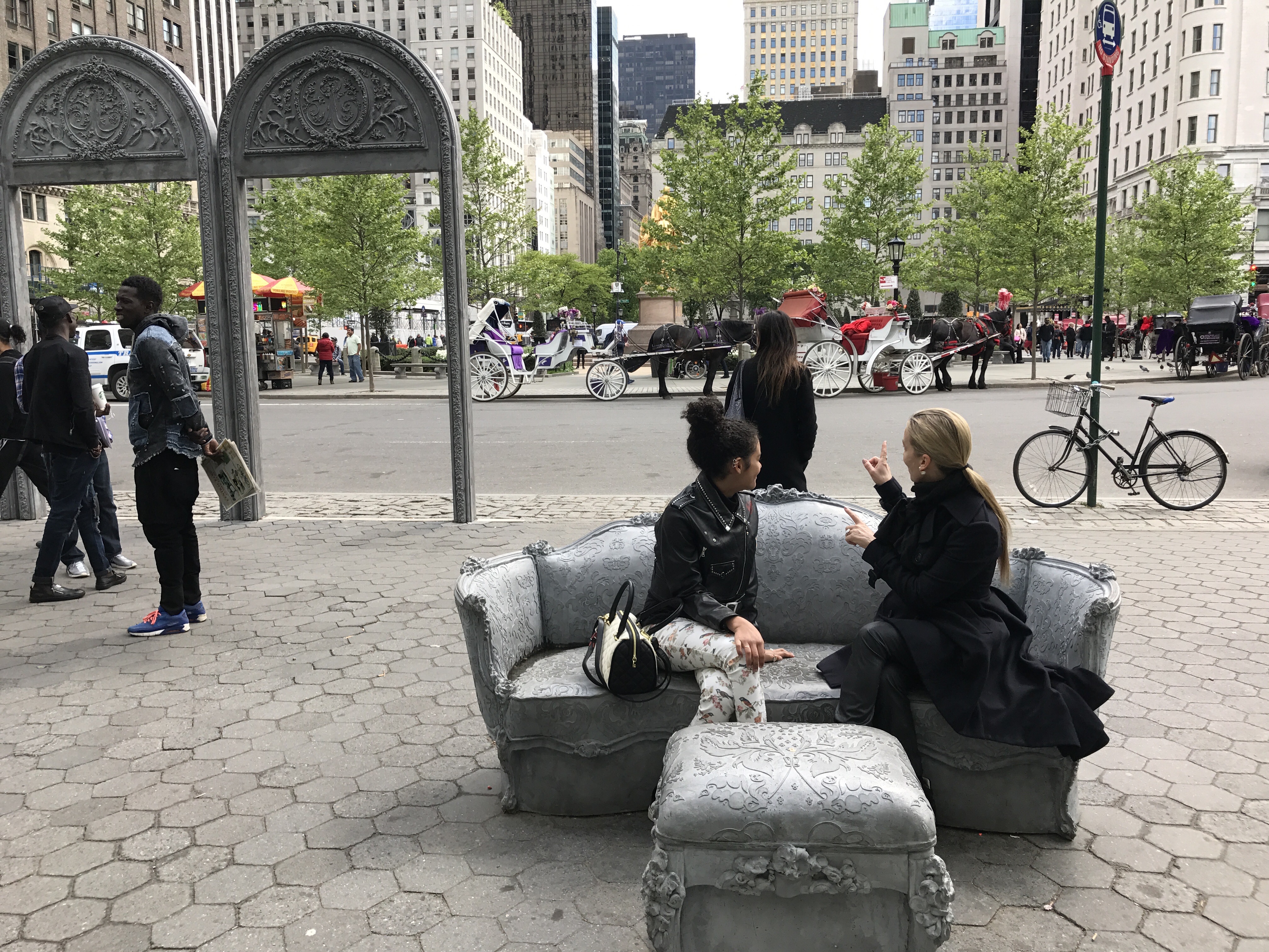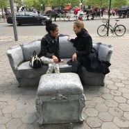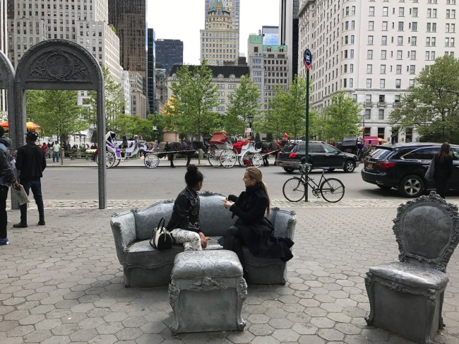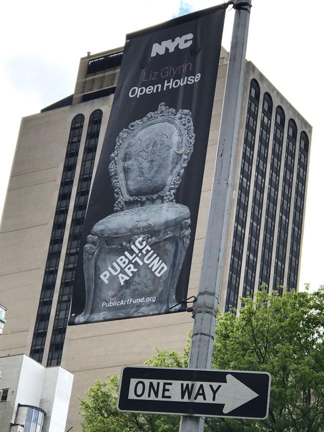 Open House transforms Doris C. Freedman Plaza into an open air ballroom where only scattered furniture and arches remain eight blocks south from the original mansion. Glynn’s lavish Louis XIV sofas, chairs, and footstools evoke the historic home, but with a twist—these objects feature sculpted additions and are cast in concrete, a populist material more commonly seen in modern architecture. With this revision, the artist invites the public to enjoy a previously exclusive interior space that is now open and accessible to all. In this strange facsimile, Glynn addresses the evolving face of a city: who has access to space in a society that is increasingly divided along socio-economic lines?