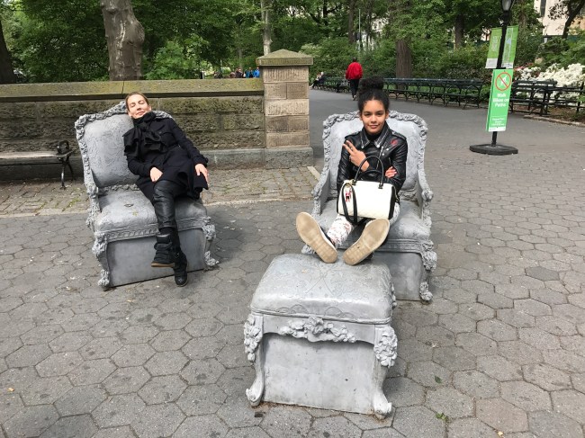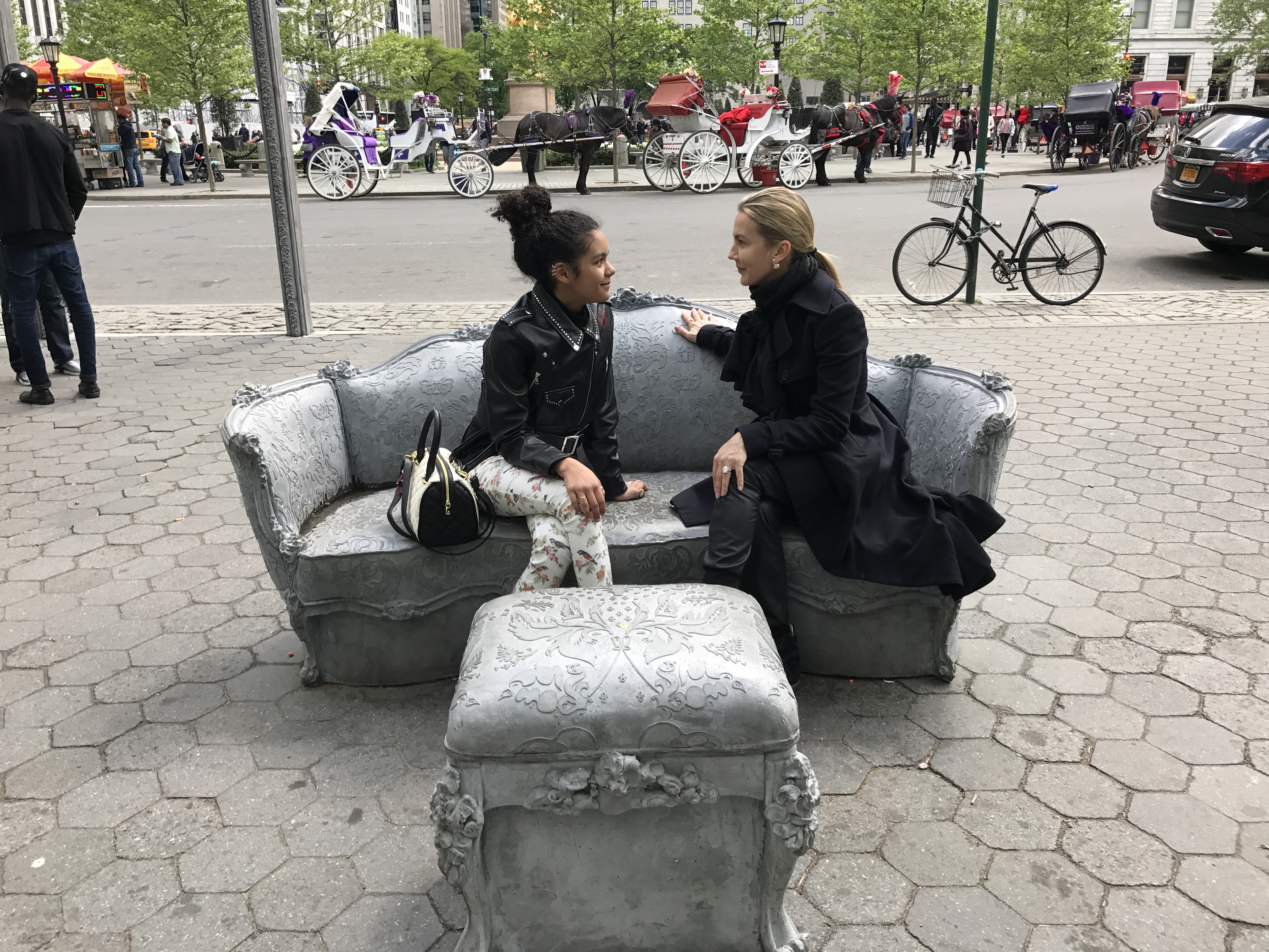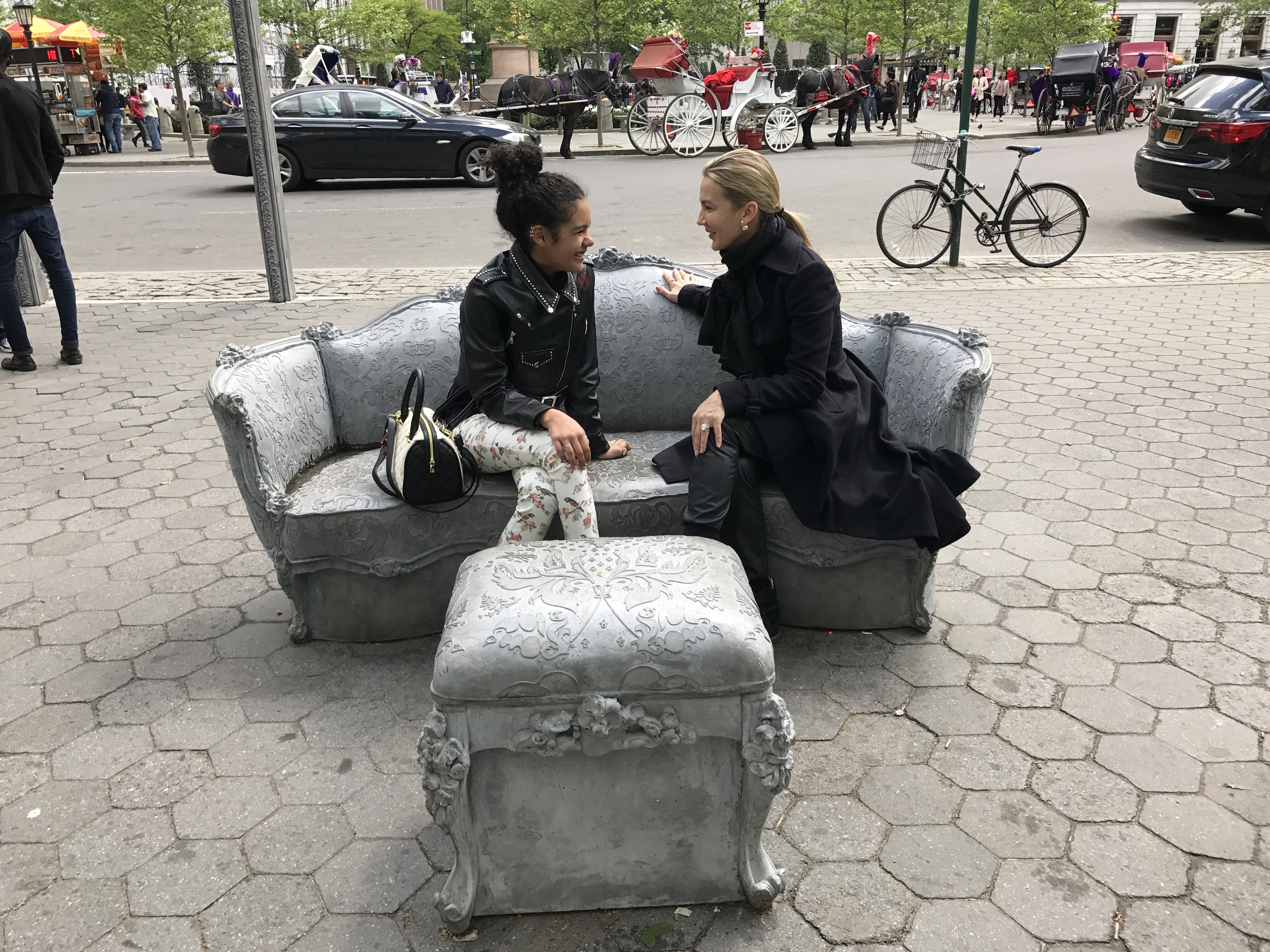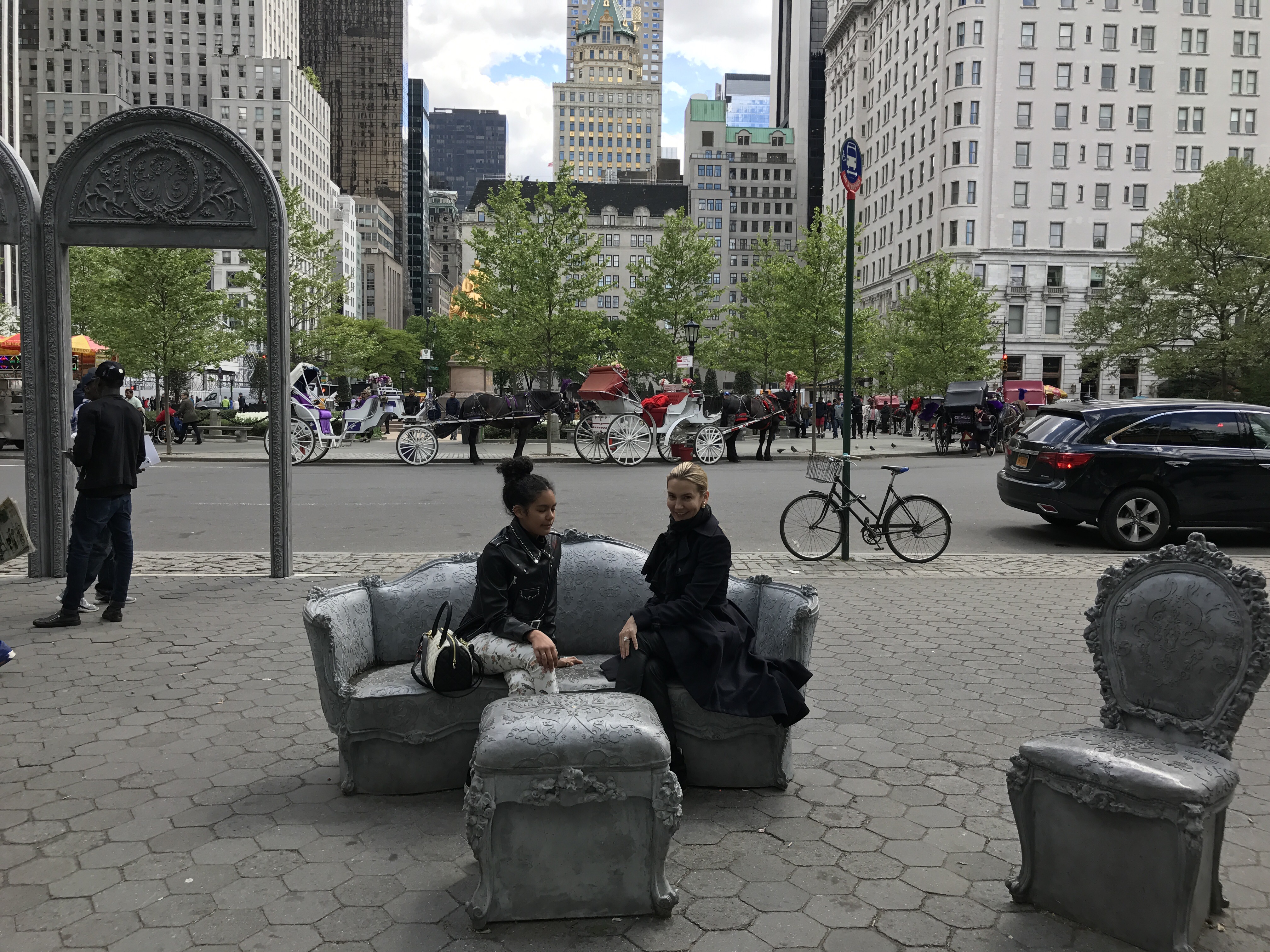 Open House transforms Doris C. Freedman Plaza into an open air ballroom where only scattered furniture and arches remain eight blocks south from the original mansion. Glynn’s lavish Louis XIV sofas, chairs, and footstools evoke the historic home, but with a twist—these objects feature sculpted additions and are cast in concrete, a populist material more commonly seen in modern architecture. With this revision, the artist invites the public to enjoy a previously exclusive interior space that is now open and accessible to all. In this strange facsimile, Glynn addresses the evolving face of a city: who has access to space in a society that is increasingly divided along socio-economic lines?