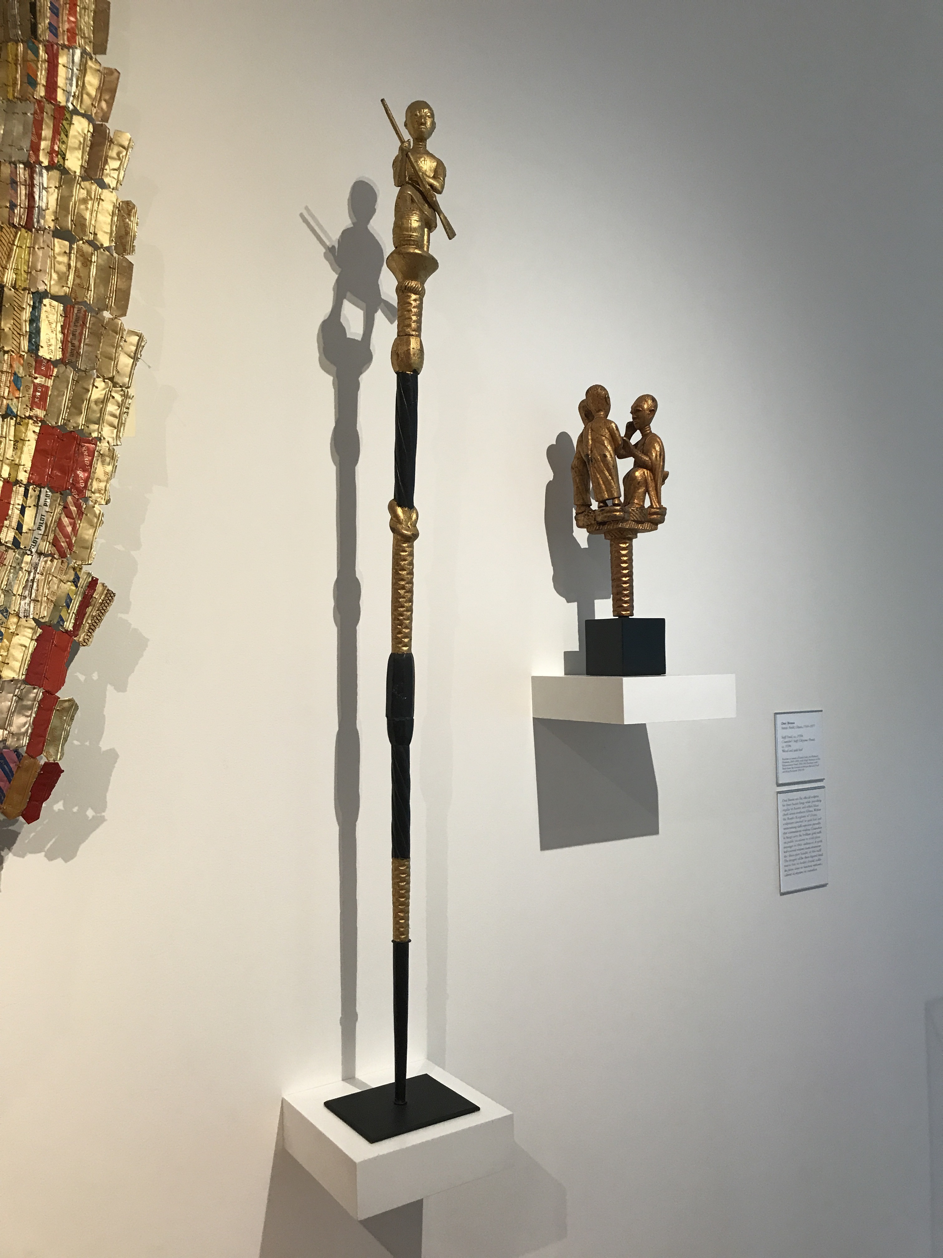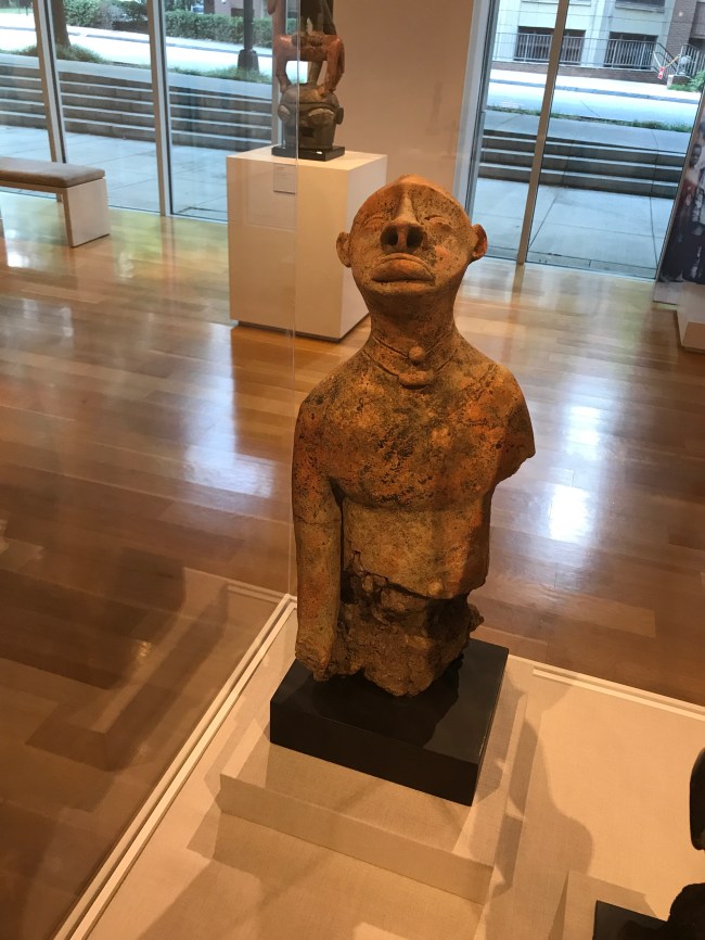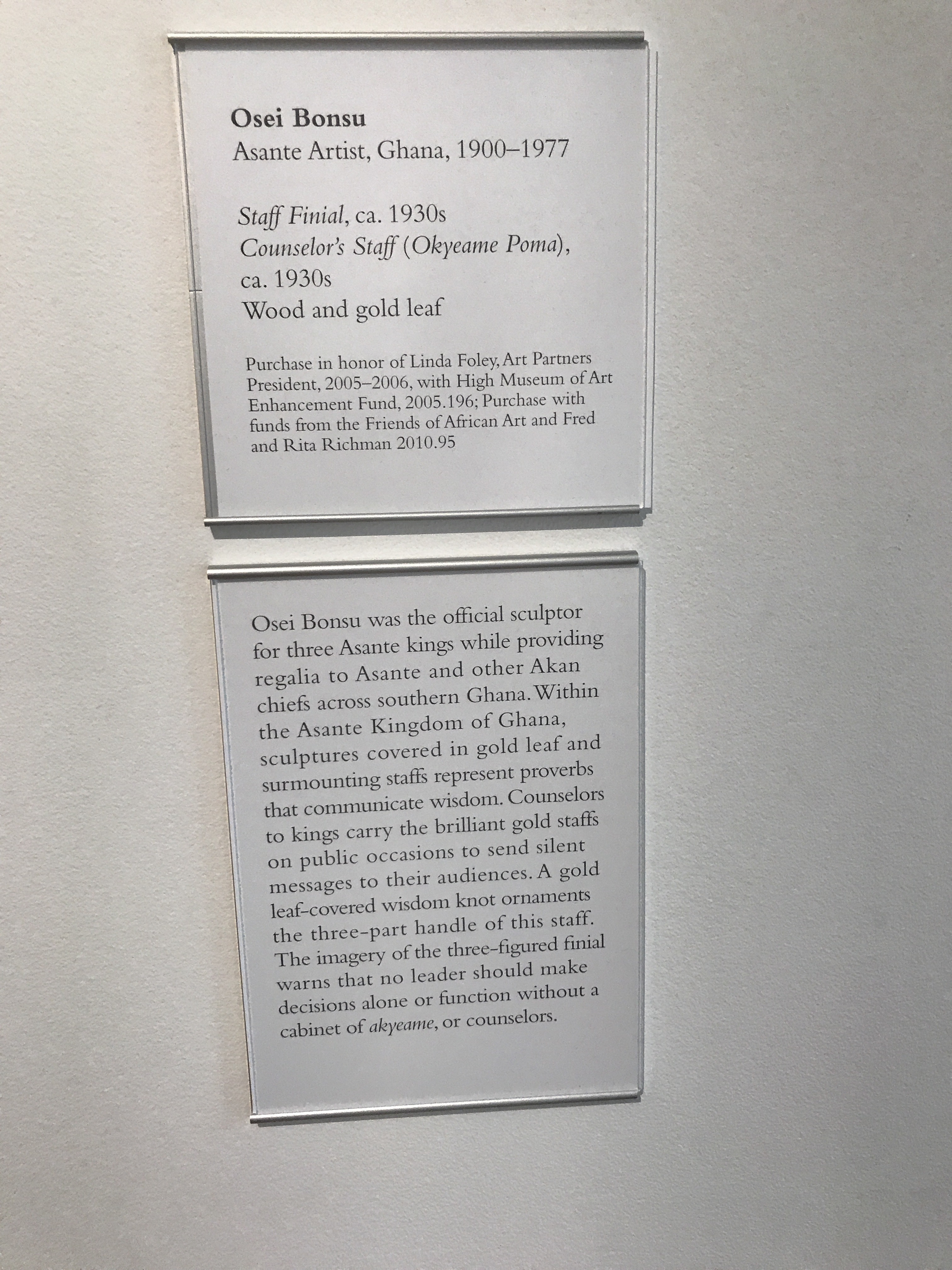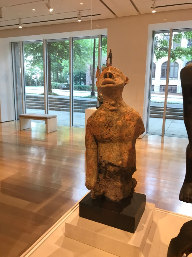 The High’s presentation juxtaposes works by unidentified artists from the distant past alongside well-known works of art by famous twentieth-century artists such as Osei Bonsu, the Asante carver commissioned by African kings and American presidents. Ancient works include a large stone tool from what is now Niger and centuries-old royal art objects from West African kingdoms, including an ivory rattle from Owo, a city famous for its ivory carvers.